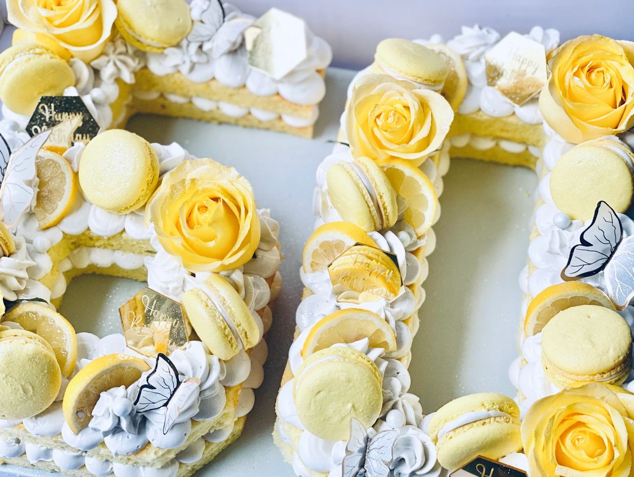 Each letter or number cake is made with two layers of cake and serves approximately 12–15 guests, depending on the shape.
