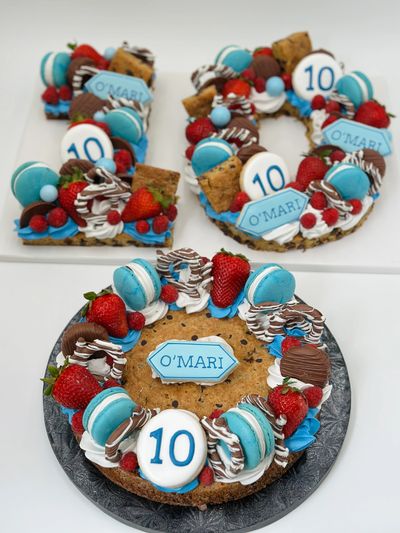 Our Chocolate Chip Cookie Cakes are a delicious twist on tradition—soft, chewy, and fully customizable. Available in a variety of shapes and styles, including letters and numbers, these cookie cakes can be dressed up for any occasion.